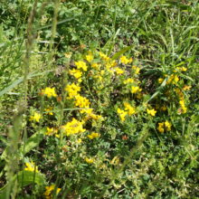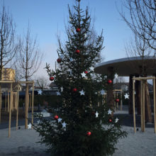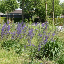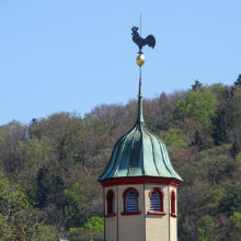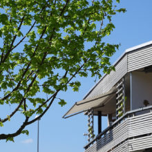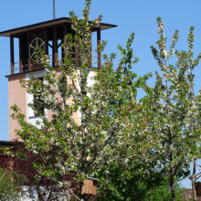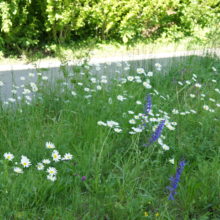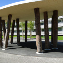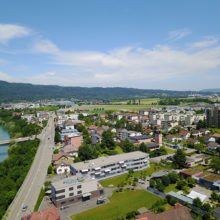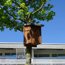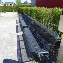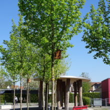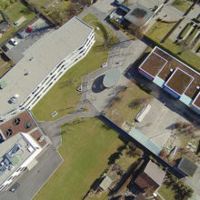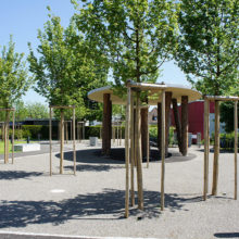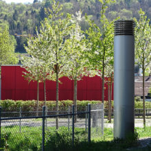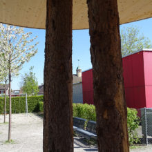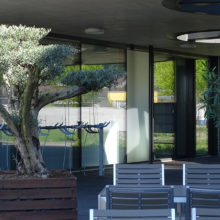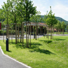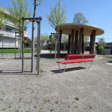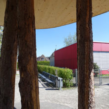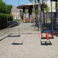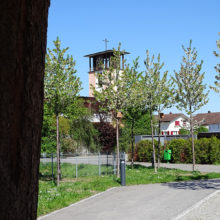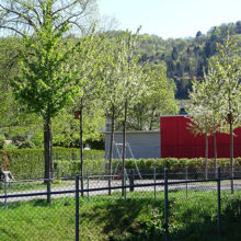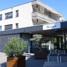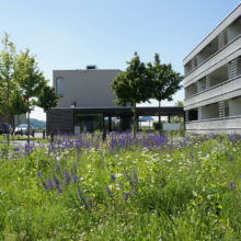 Vor dem Wohngebäude, in Richtung Süden, befindet sich eine Blumenwiese. Baumgruppen von Feldahorn- und Vogelkirschenbäumen spenden Schatten. Die Nistkästen wurden von den Rheinfels-Park-Bewohnern gespendet. Inmitten der Anlage steht ein Pavillon, welcher von der Bewohnerschaft für Gartenfeste benutzt werden kann. Sitzbänke, Trinkbrunnen und ein kleiner Spielplatz laden zum Verweilen ein. In Sichtweite sind die Kirchtürme der kath. und ref. Kirche zu sehen sowie verdeckt hinter den Büschen liegt der Friedhof. Als nächster Nachbar befindet sich der Kindergarten und dessen Aussenspielplatz.